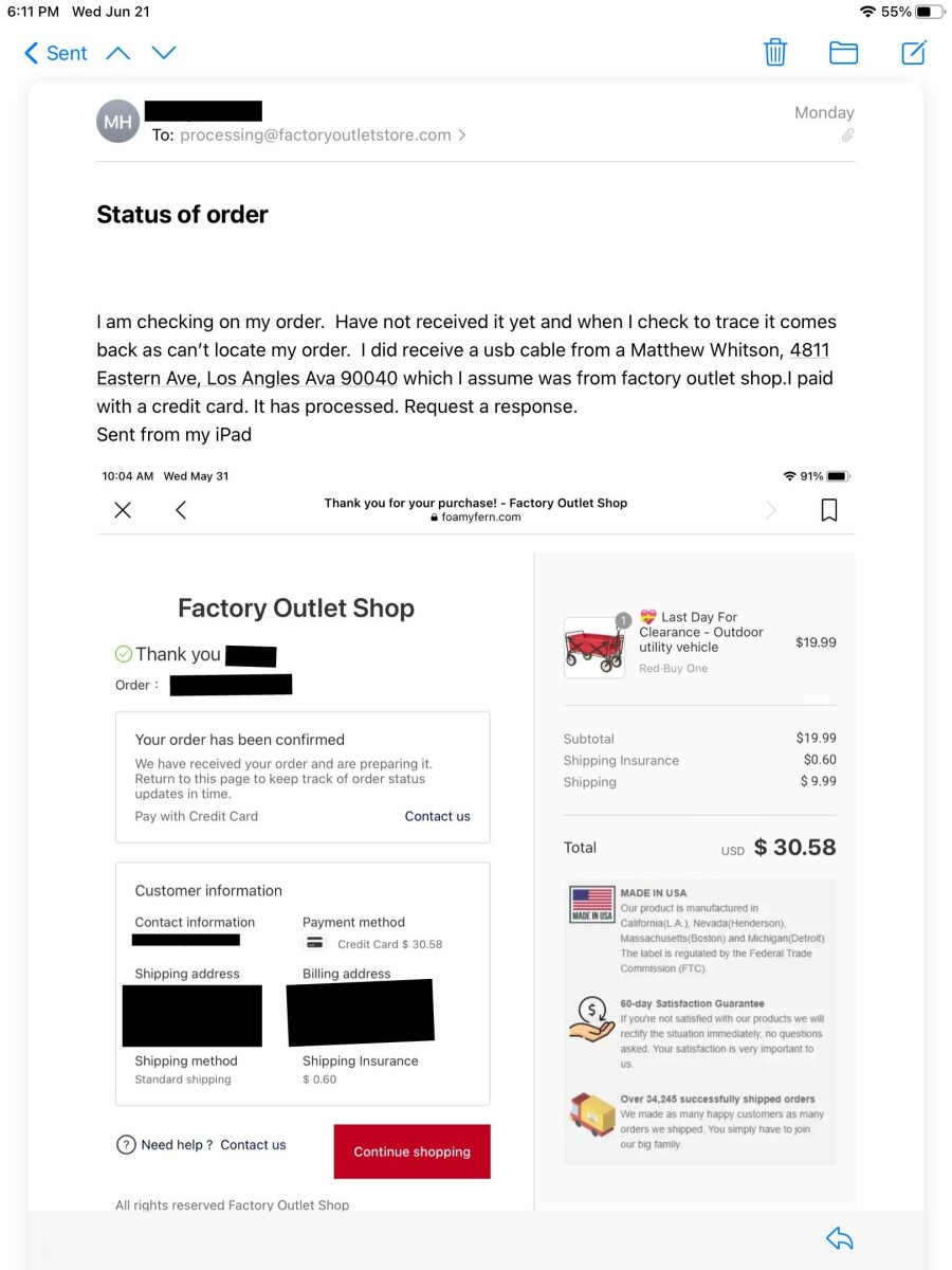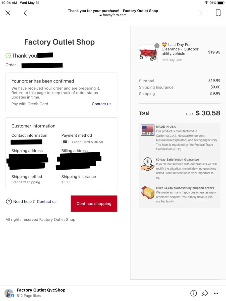 لقد طلبت عربة متعددة الاستخدامات في الهواء الطلق. تلقيت سلك USB. لقد طلبت من الفيسبوك. اعتقدت أنها كانت من التسوق في QVC. كان مقابل 19.99 دولارًا بالإضافة إلى الشحن. يتم الدفع ببطاقة ائتمان. أرسل بريدًا إلكترونيًا إلى الشركة التي أعطتني رقم التتبع (23053122005****)، ولم يتم الرد حتى الآن.