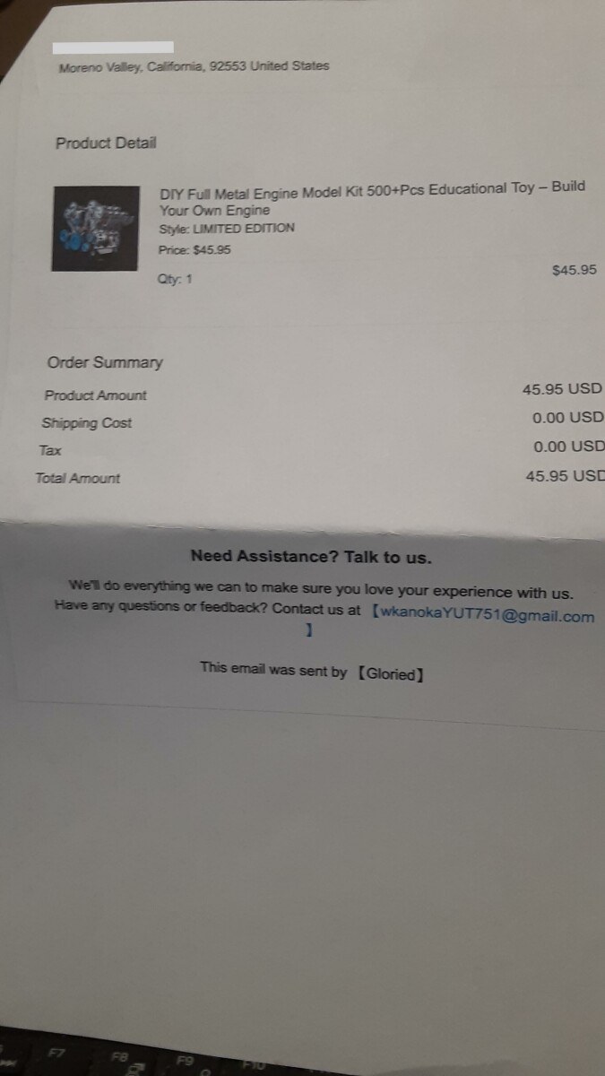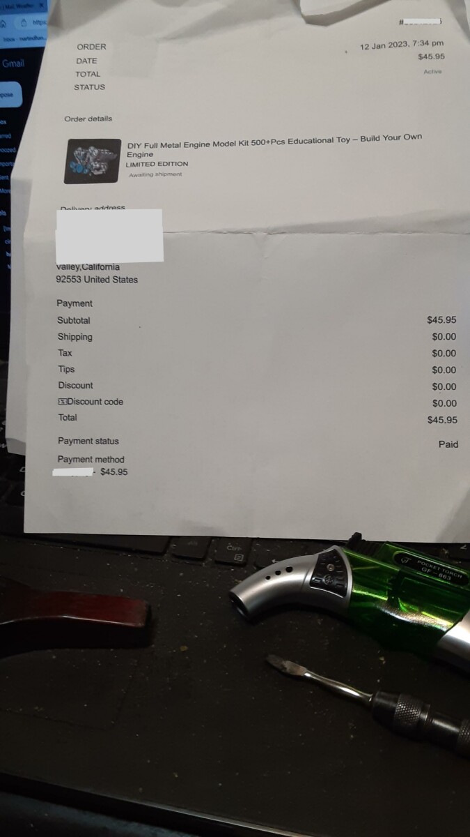 I ordered a DIY Engine Model Kit with 500+ Pcs. for $45.95 on 01/12/23. Have not received it yet. My cc was charged.
