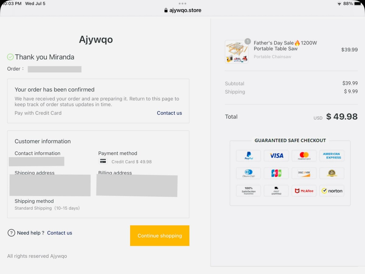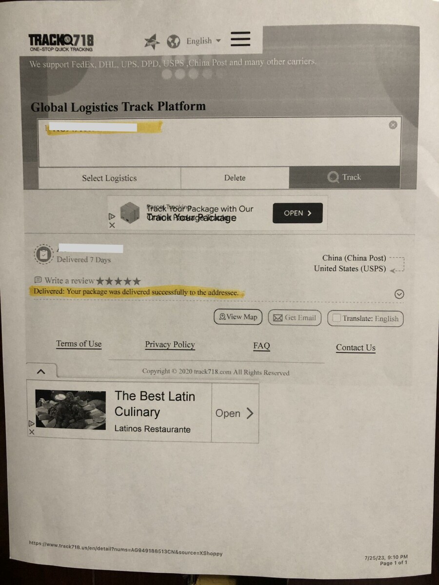 我没订购的纽约州 College Point 11356我确实在网上订购了一些东西,但我收到了一封电子邮件,里面有追踪编码,上面写着包裹已送达,直到今天 23 年 7 月 25 日我还没收到。我想我被骗了,收到了来自 Mark Cadicamo 的包裹,而不是我最初订购的订单。