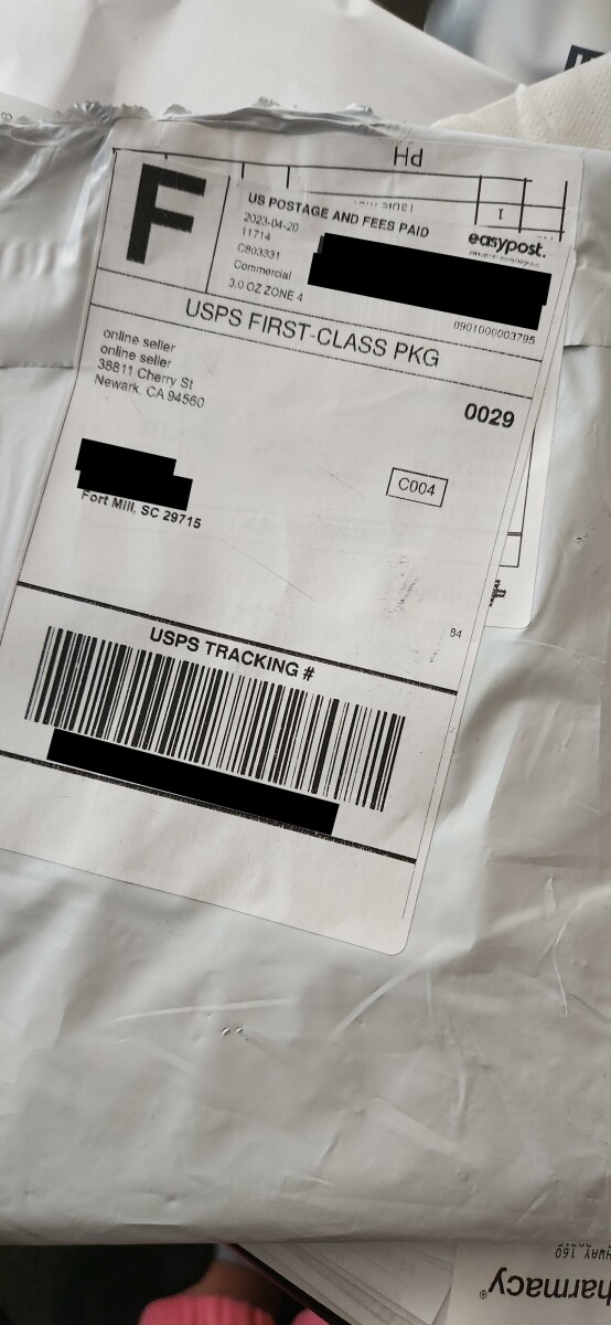 包裹来自:在线卖家 38811 Cherry St 加利福尼亚州纽瓦克 94560 包装中有某种类型的塑料